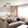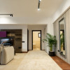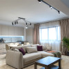 Open-space generos, unde livingul și bucătăria se îmbină armonios. Ferestrele mari și draperiile elegante aduc multă lumină naturală, creând un ambient relaxant. Mobilierul în tonuri neutre, completat de accente rafinate, oferă un aer sofisticat și atemporal.